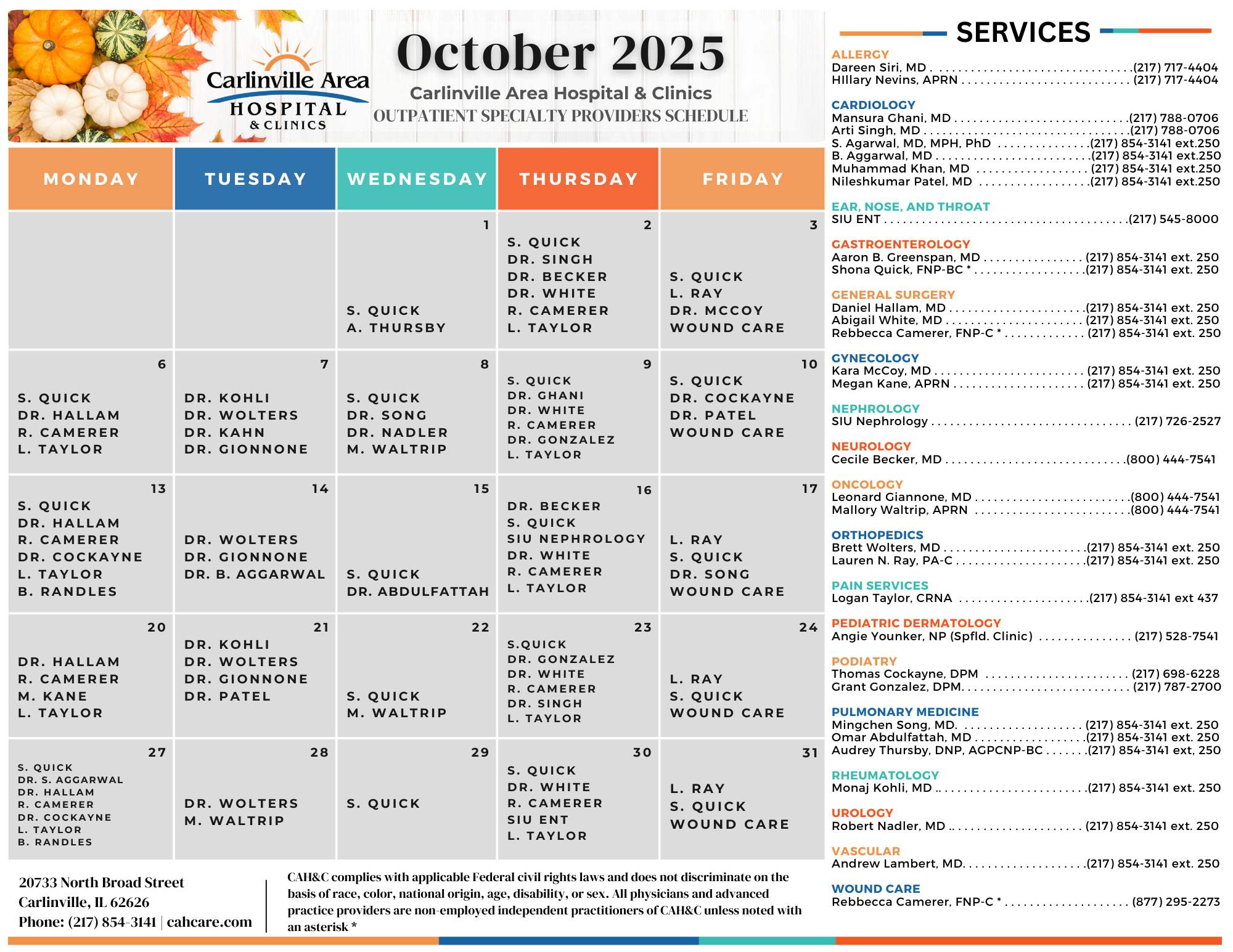 Each week, medical specialists travel to Carlinville Area Hospital to help our patients get the specialized care they need, close to home. Many of these outpatient providers require a referral from the patient’s care provider. If you would like more information about scheduling an appointment with one of the medical specialists, contact the Carlinville Area Hospital Outpatient Department at 217-854-3141 ext. 250 or the appointment number listed below.