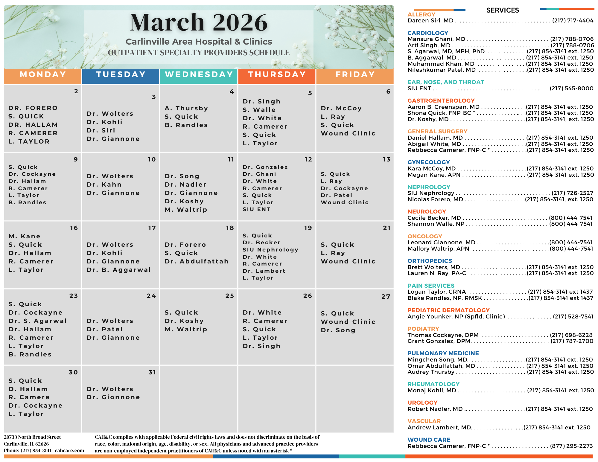 Each week, medical specialists travel to Carlinville Area Hospital to help our patients get the specialized care they need, close to home. Many of these outpatient providers require a referral from the patient’s care provider. If you would like more information about scheduling an appointment with one of the medical specialists, contact the Carlinville Area Hospital Outpatient Department at 217-854-3141 ext. 1250 or the appointment number listed below.