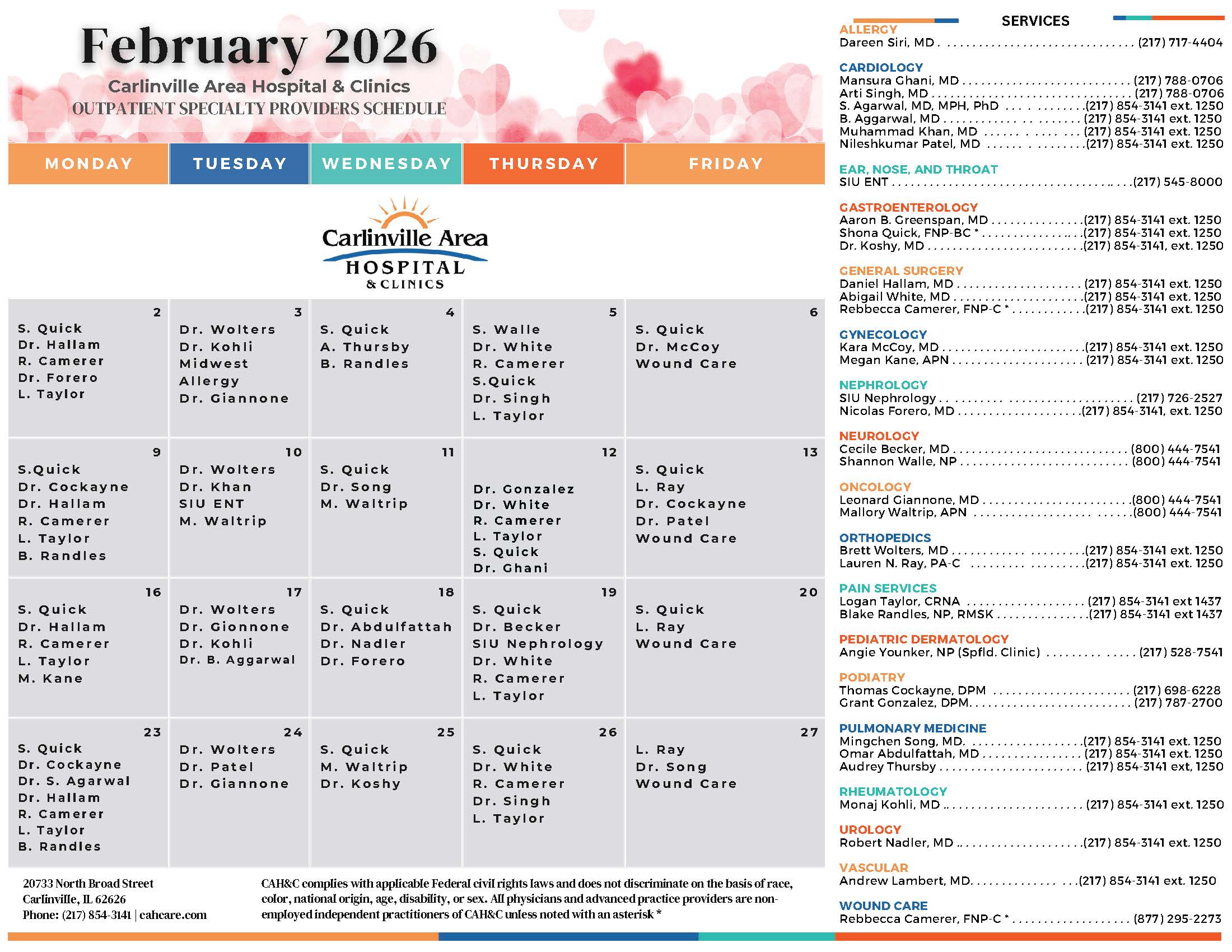 Each week, medical specialists travel to Carlinville Area Hospital to help our patients get the specialized care they need, close to home. Many of these outpatient providers require a referral from the patient’s care provider. If you would like more information about scheduling an appointment with one of the medical specialists, contact the Carlinville Area Hospital Outpatient Department at 217-854-3141 ext. 1250 or the appointment number listed below.